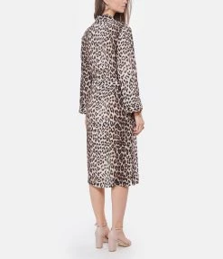 Robe longue à imprimé panthère marron. Col tailleur. Manches longues. Fermeture boutonnée. Deux poches passepoilées. Ceinture amovible à nouer à la taille. Deux fentes de 23 cm sur les côtés. Coupe droite. Base droite. Non doublée.