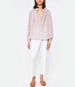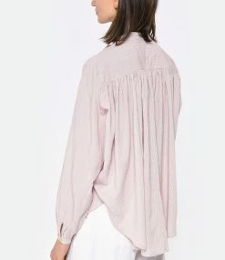 Blouse fluide à rayures rouges. Col mao. Encolure nouée par des liens. Epaules et dos froncés. Manches longues resserrées par boutons. Coupe droite. Base droite.