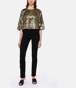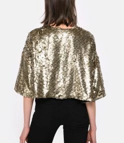 Top court à sequins dorés. Manches courtes. Col rond. Coupe droite. Base droite