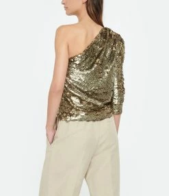 Top asymétrique à sequins dorés. Une manche longue et une épaule dénudée. Encolure asymétrique. Coupe droite. Base droite.