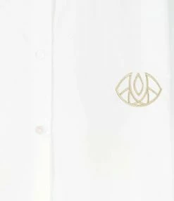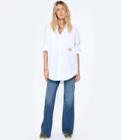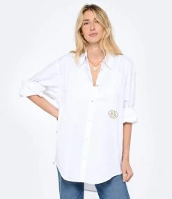 Chemise en popeline de coton blanc. Logo doré brodé sur l’avant. Col chemisier. Manches longues avec fentes et poignets boutonnés. Petits boutons blancs nacrés. Coupe oversized. Base arrondie, plus longue à l’arrière.