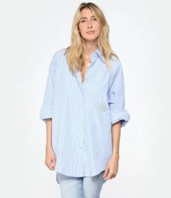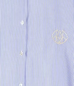 Chemise en popeline de coton à fines rayures bleues. Logo doré brodé sur l’avant. Col chemisier. Manches longues avec fentes et poignets boutonnés. Petits boutons blancs nacrés. Coupe oversized. Base arrondie, plus longue à l’arrière.