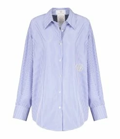 Chemise en popeline de coton à fines rayures bleues. Logo doré brodé sur l’avant. Col chemisier. Manches longues avec fentes et poignets boutonnés. Petits boutons blancs nacrés. Coupe oversized. Base arrondie, plus longue à l’arrière.