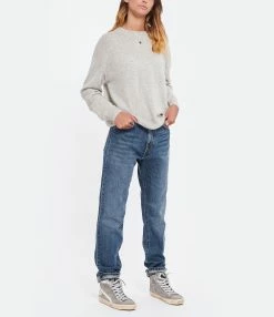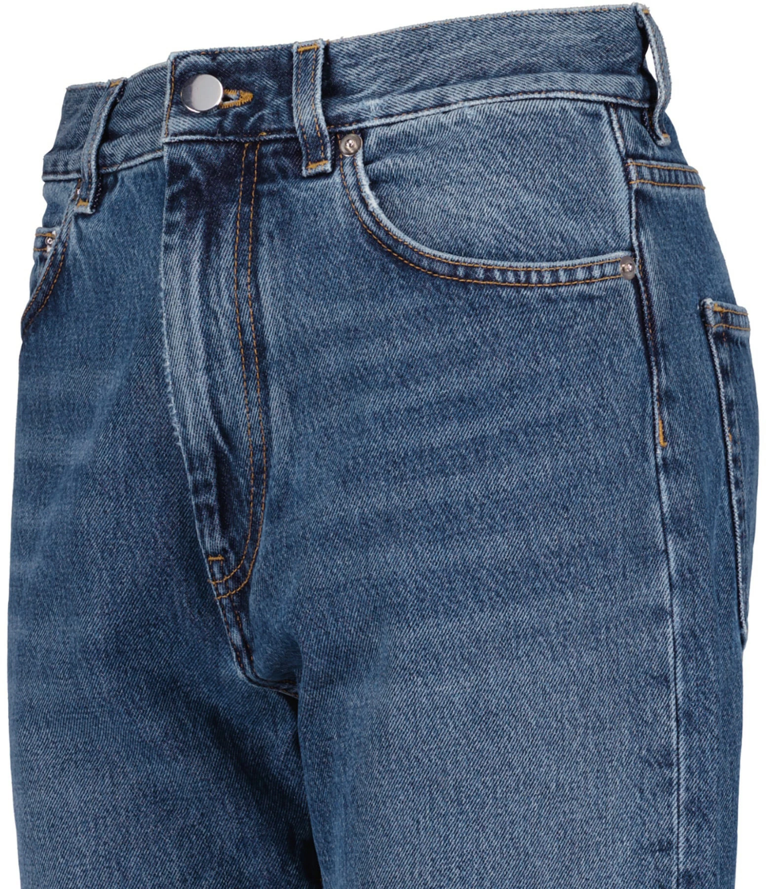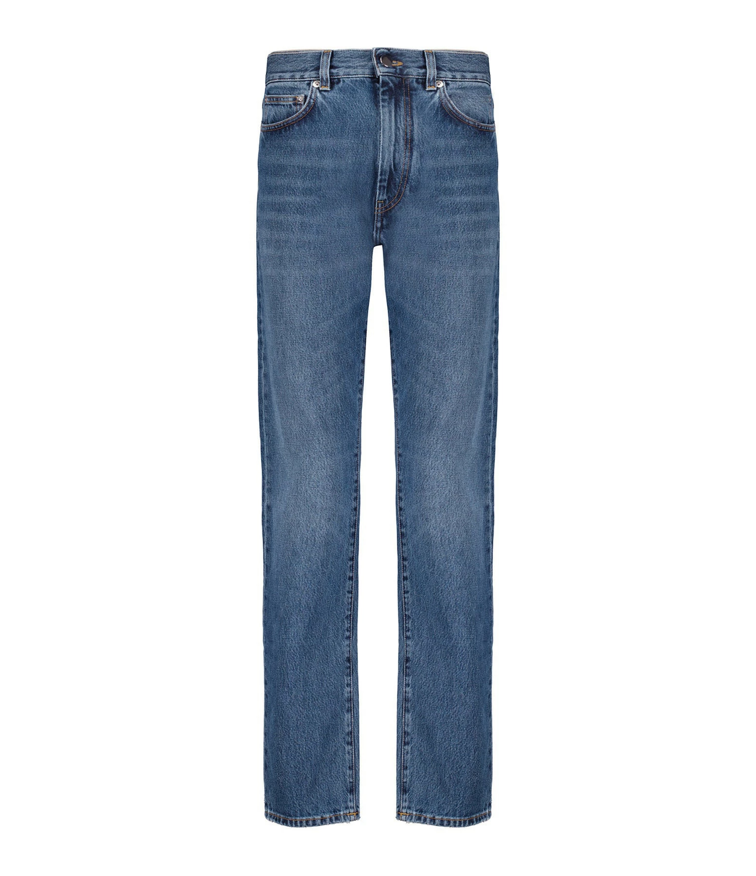 Pantalon en denim de coton bleu délavé. Passants pour ceinture. Braguette zippée et boutonnée. Boutons et rivets métalliques argentés. Deux poches italiennes et une poche à gousset. Deux poches plaquées dans le dos. Jacron blanc dans le dos. Coupe droite. Base droite avec effet usé.