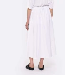 Jupe mi-longue en coton blanc. Taille élastiquée avec cordon de serrage sur le devant. Coupe évasée. Base droite.