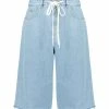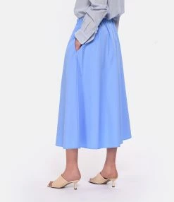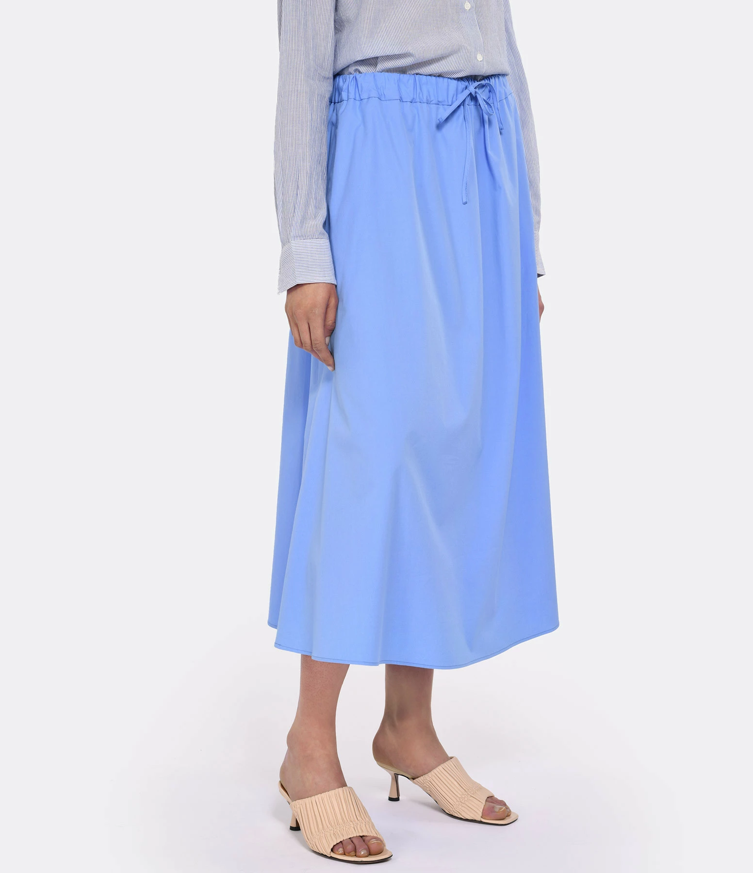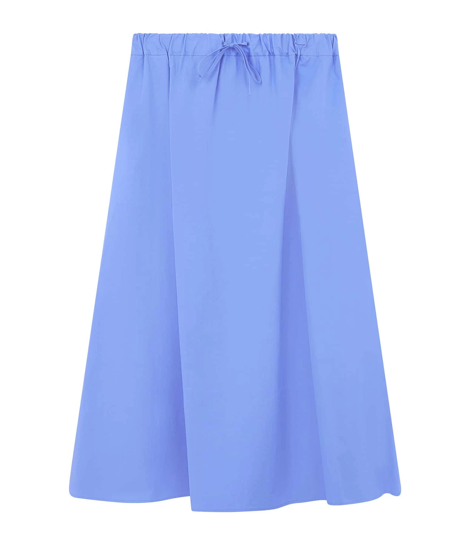 Jupe mi-longue en coton bleu. Taille élastiquée avec cordon de serrage sur le devant. Coupe évasée. Base droite.