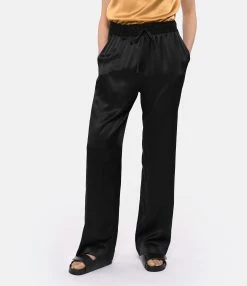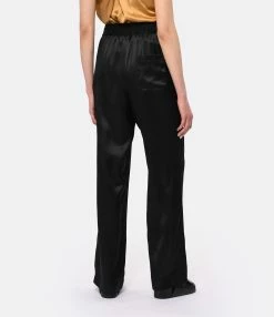 Pantalon fluide en soie noir. Taille élastiquée avec cordon de serrage sur le devant. Deux poches latérales et une poche plaquée à l’arrière. Coupe droite. Base droite.