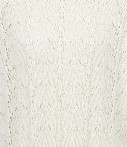 Robe courte en coton crocheté ivoire. Col rond côtelé. Manches trois-quarts évasées. Coupe droite. Base légèrement ondulée.