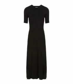 Robe longue côtelée noire. Manches courtes. Col rond. Coupe ajustée puis évasé. Base droite.
