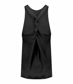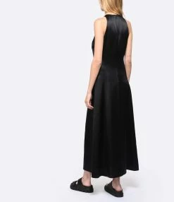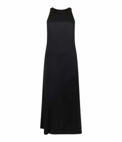 Robe longue en soie soir sans manches. Fentes latérales au bas. Col rond. Coupe droite. Base droite.