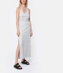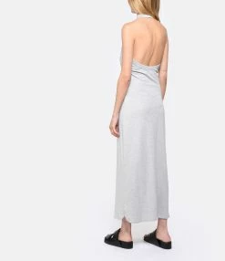 Robe longue grise dos nu. Col rond côtelé. Fente latérale au bas. Coupe droite. Base droite.