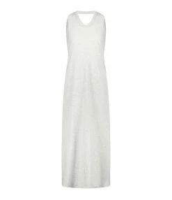 Robe longue grise dos nu. Col rond côtelé. Fente latérale au bas. Coupe droite. Base droite.