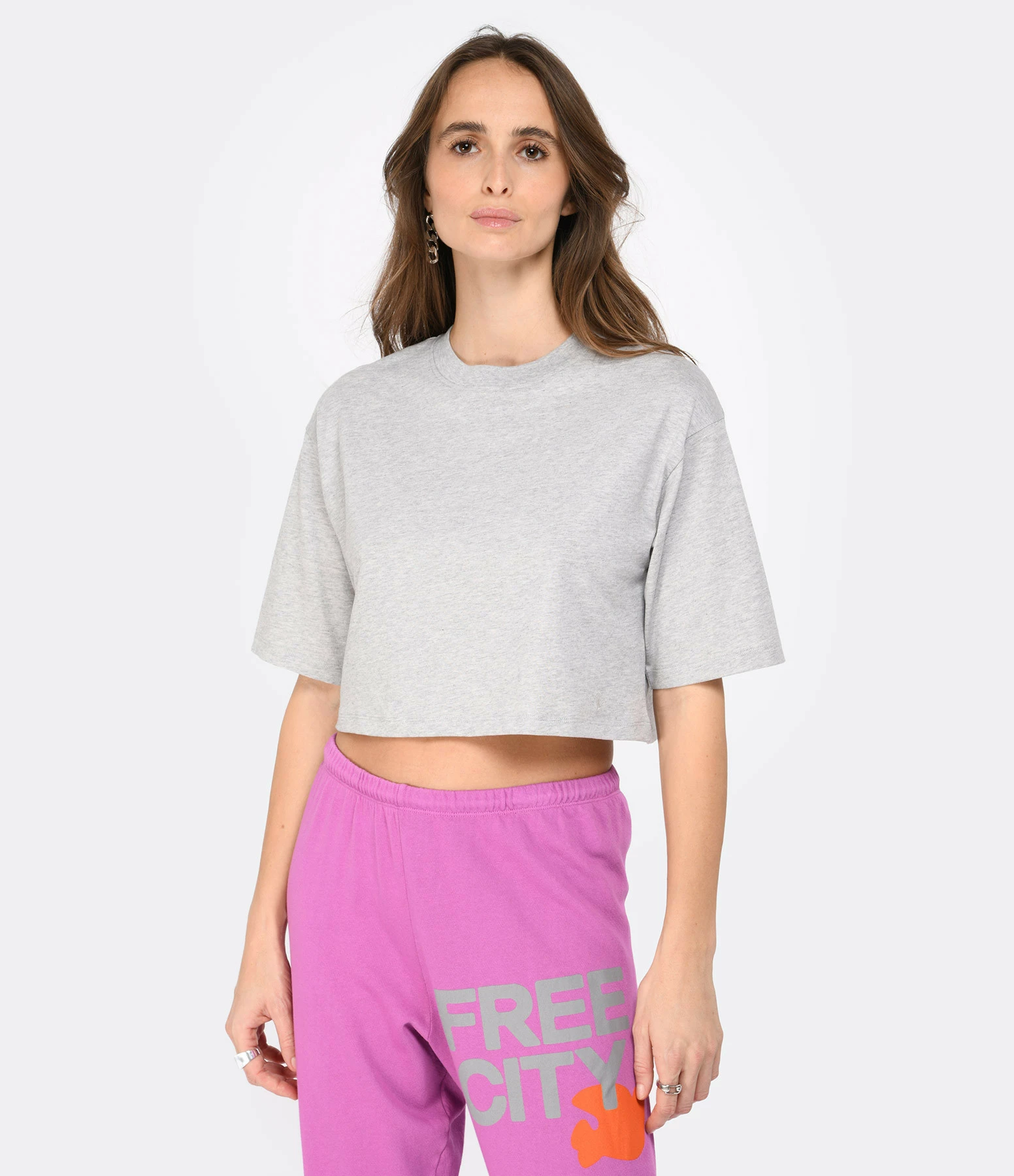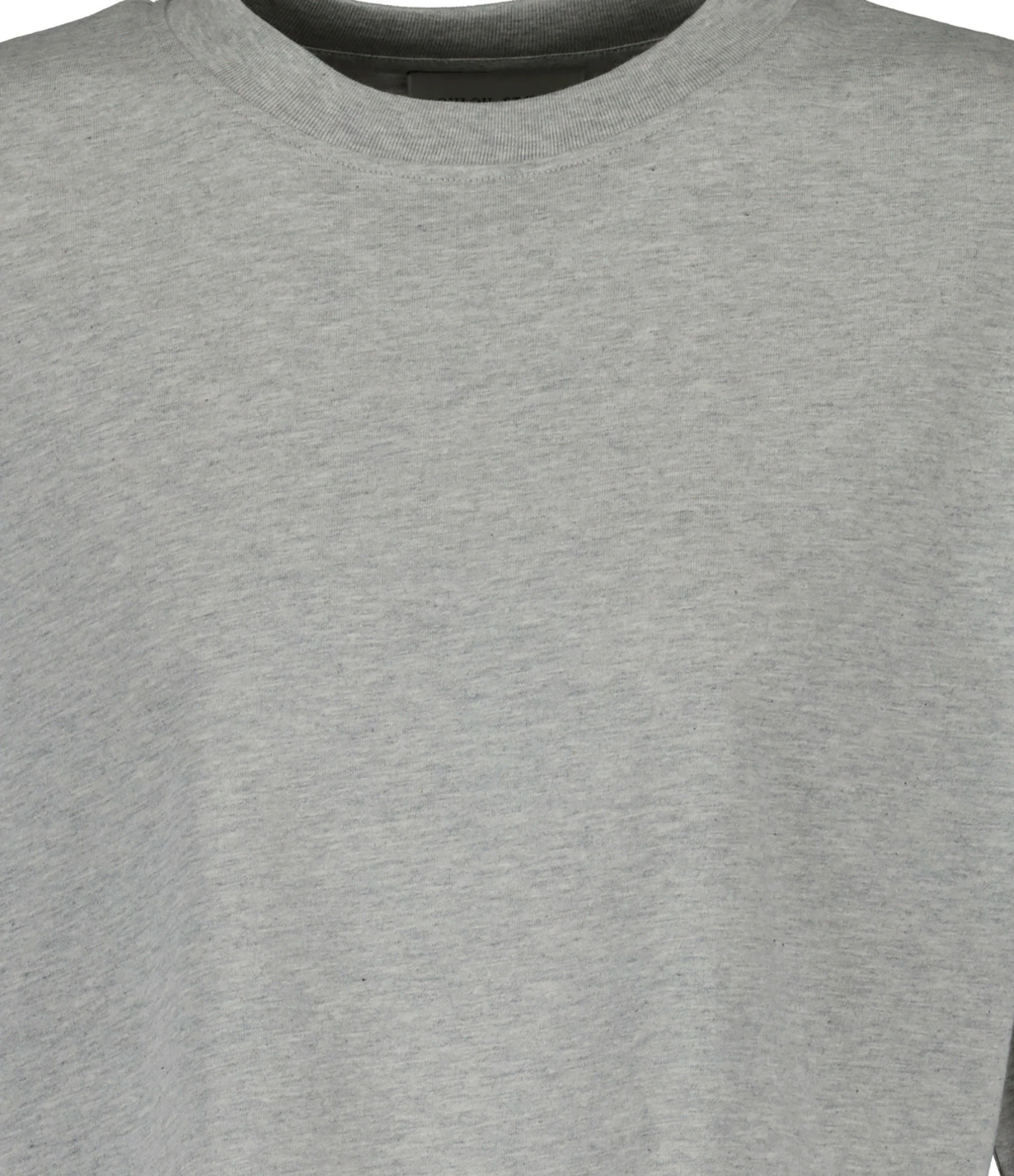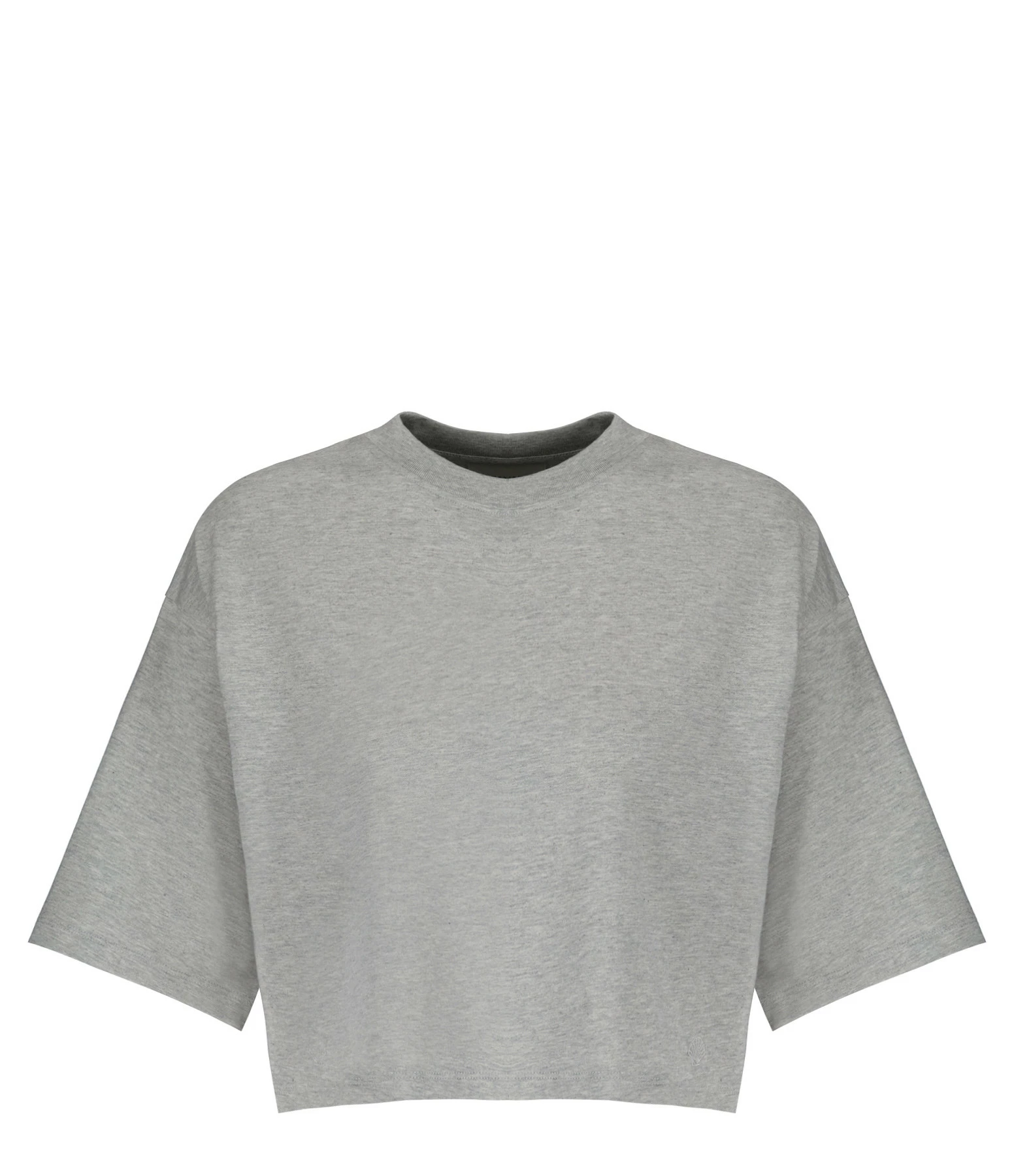 Tee-shirt en coton gris chiné avec le logo coquillage brodé ton sur ton sur le devant. Col rond côtelé. manches courtes. Coupe droite. Longueur raccourcie. Base droite.
