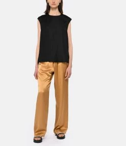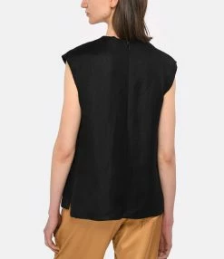 Top noir sans manches. Fermeture par boutons noirs mats sur les côtés. Col rond. Coupe droite. Base droite coupée à cru.