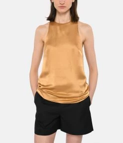Top en soie camel à bretelles croisées dans le dos. Sans manches. Fermeture zippée invisible latérale. Coupe droite. Base droite.