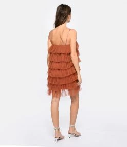 Robe courte en tulle rouge à volants étagés ornée de strass sur les bretelles. Encolure carrée élastiquée. Sans manches. Fines bretelles. Coupe ample. Base droite. Doublée.