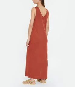 Robe longue en bambou rouge brique. Col V. Base droite. Non doublé.
