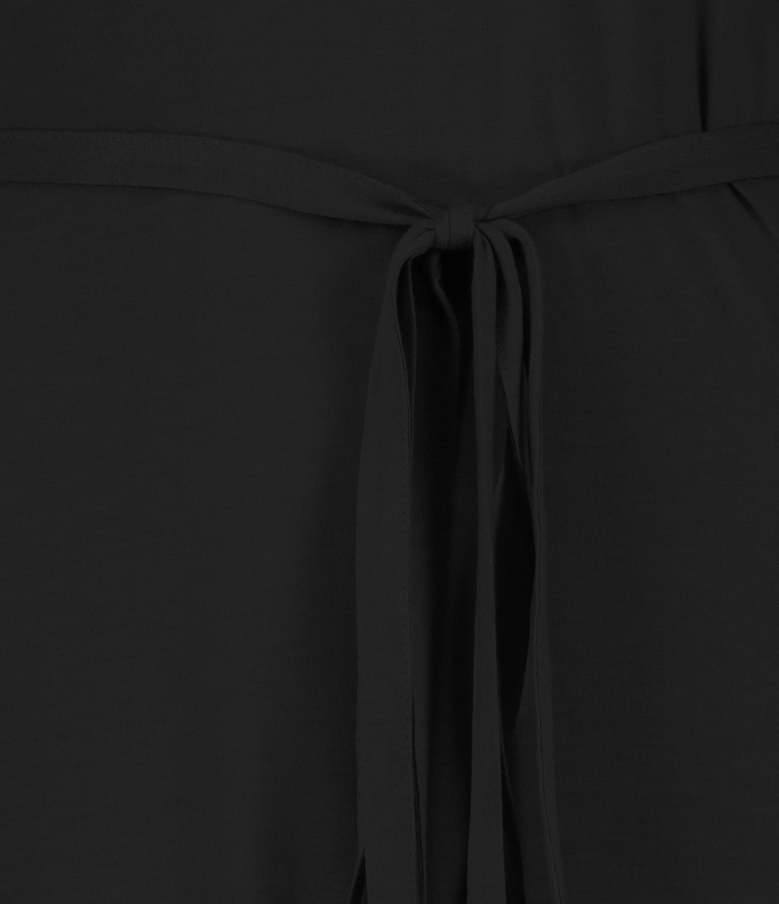 Robe longue en bambou noir. Col arrondi. Manches courtes. Cordon à nouer autour de la taille. Coupe droite. Base droite.