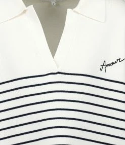 Pull marinière blanc et noir. Broderie noire “Amour” côté cœur. Col en V. Manches longues. Coupe droite. Base droite.