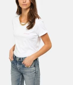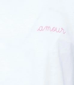 Tee-shirt manches-courtes en coton blanc. Inscription “Amour” en rose. Col rond. Manches roulottées. Coupe droite et base arrondie.