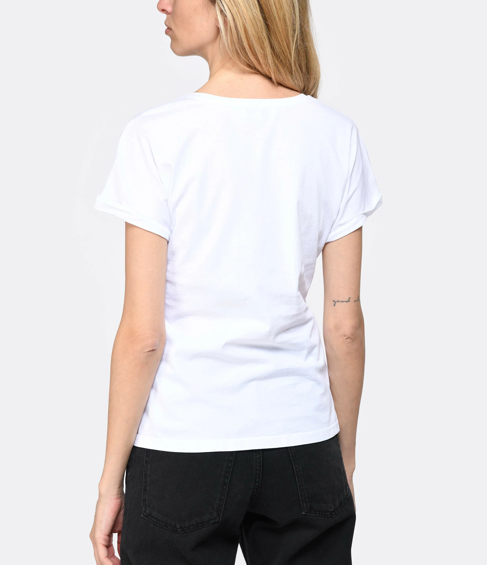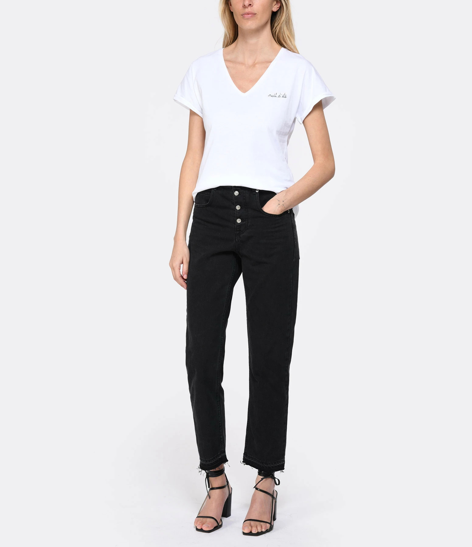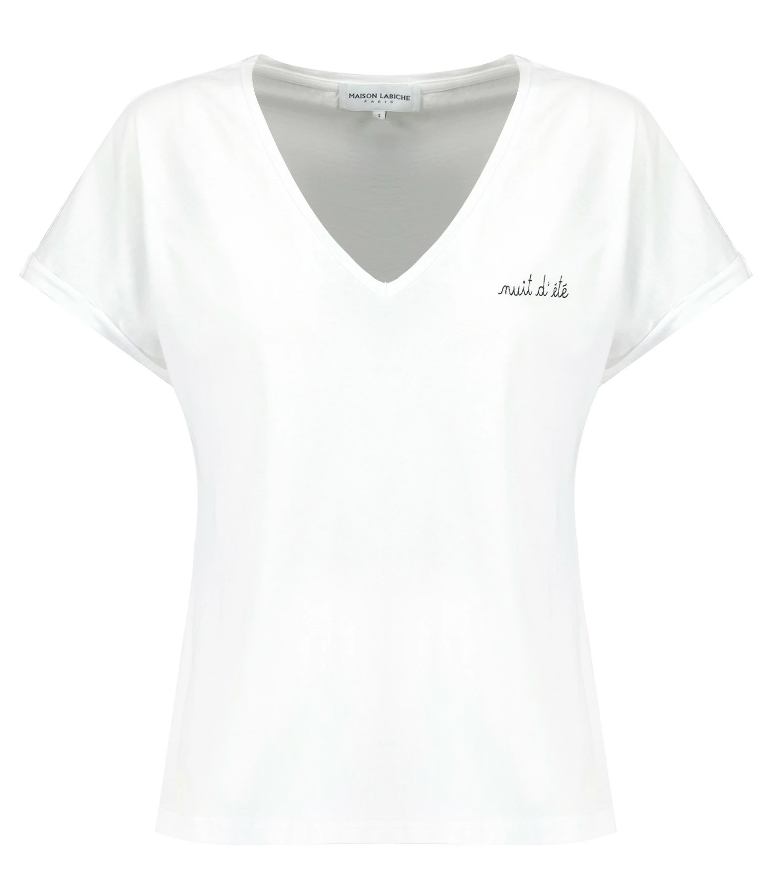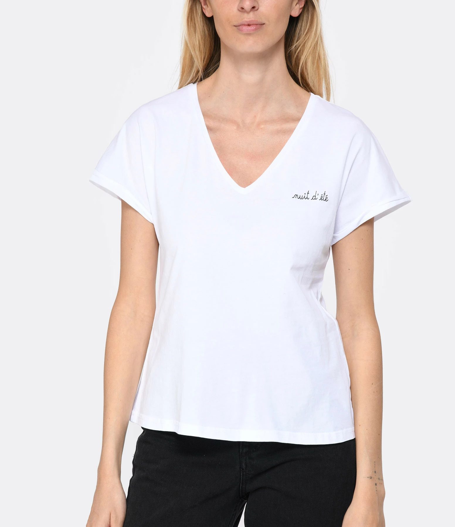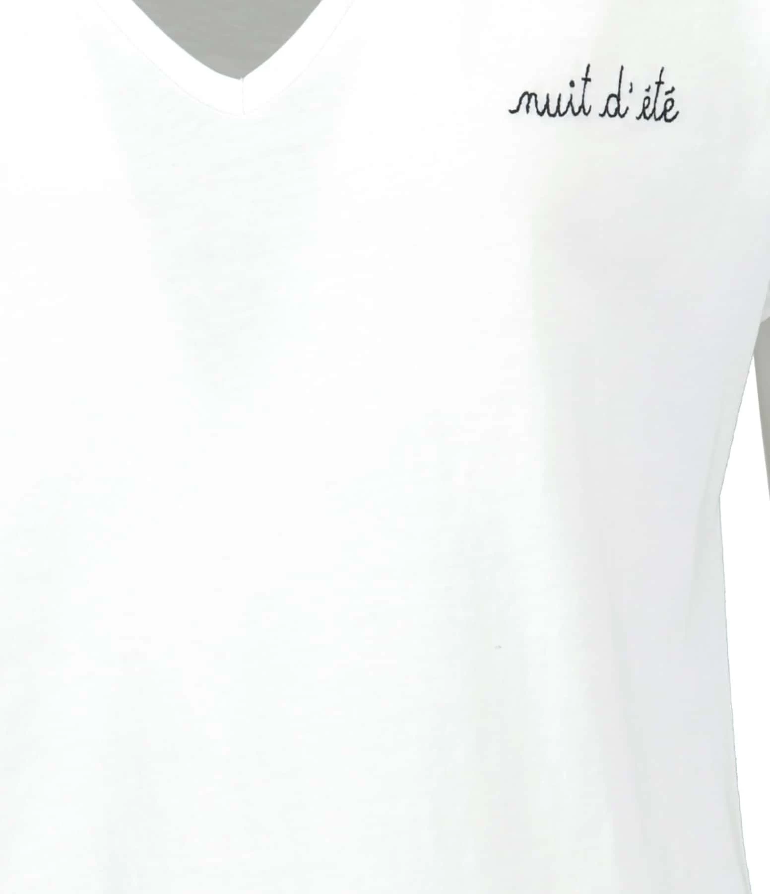 Tee-shirt à manches courtes blanc. Broderie noire “nuit d’été” côté cœur sur le devant. Col en V. Manches courtes. Coupe droite. Base droite.
