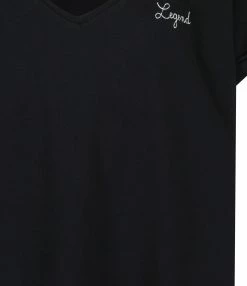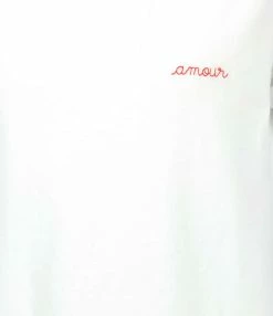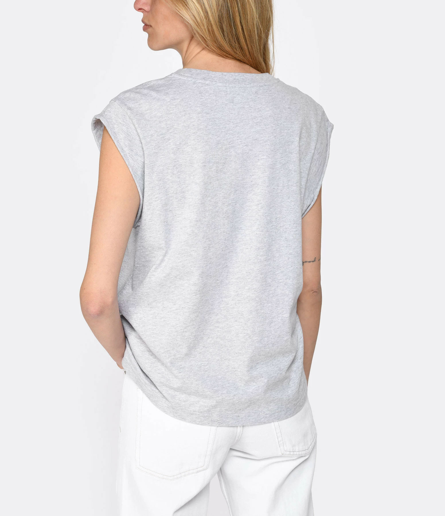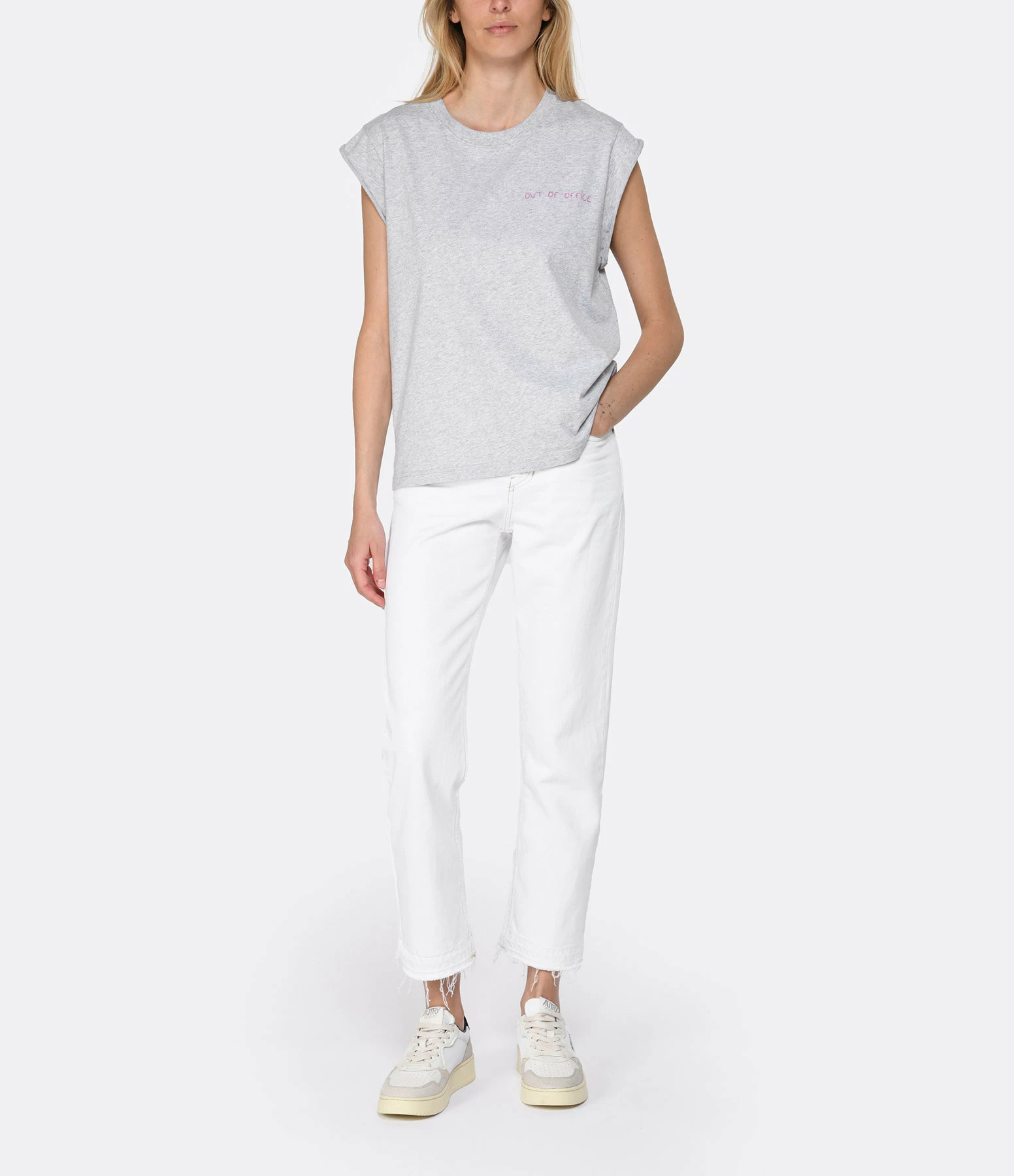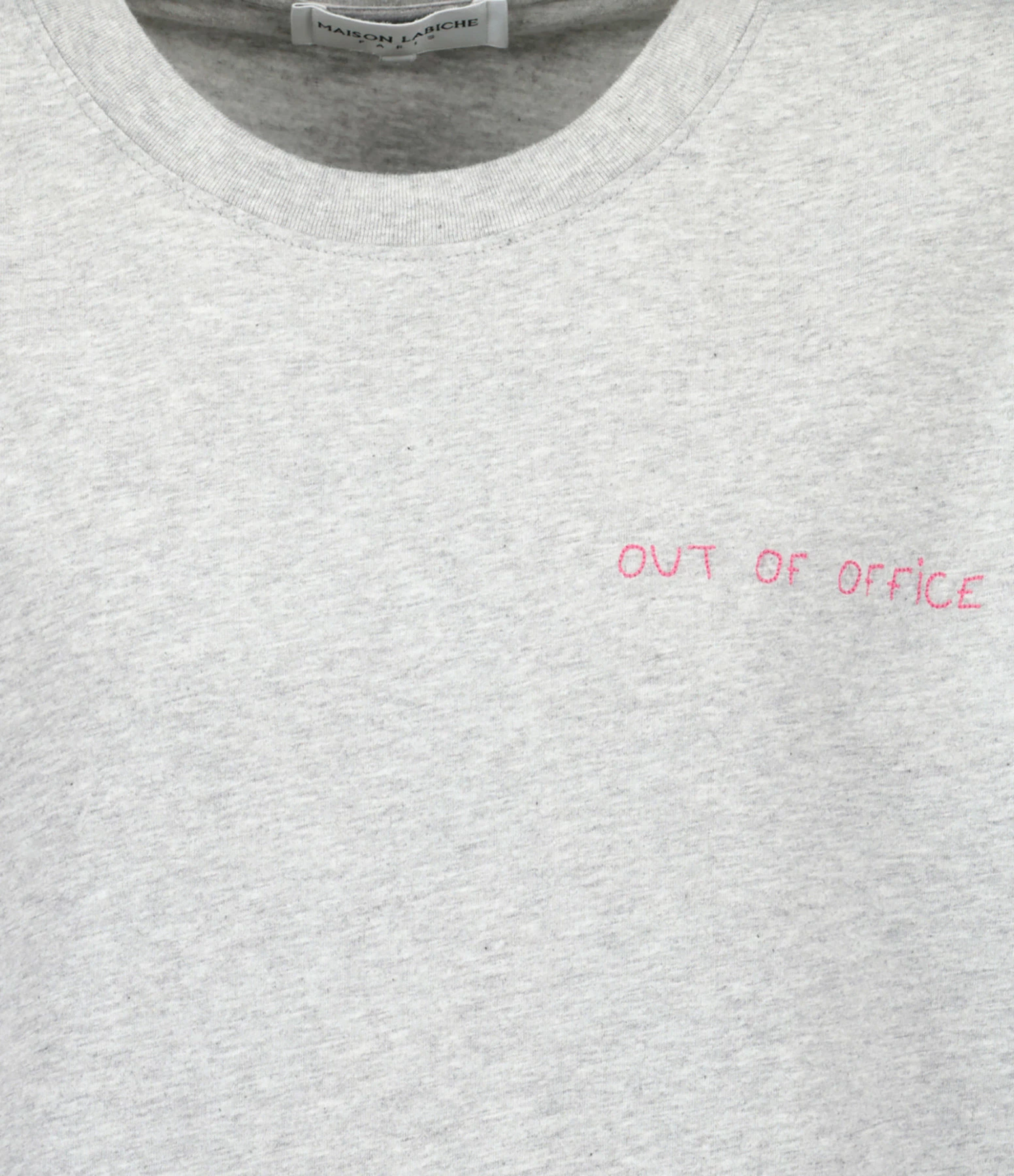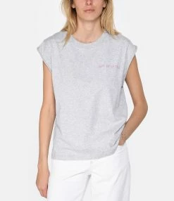 Débardeur en coton biologique gris avec broderie rose “out of office” côté cœur. Manches retroussées. Col rond. Coupe droite. Base droite.