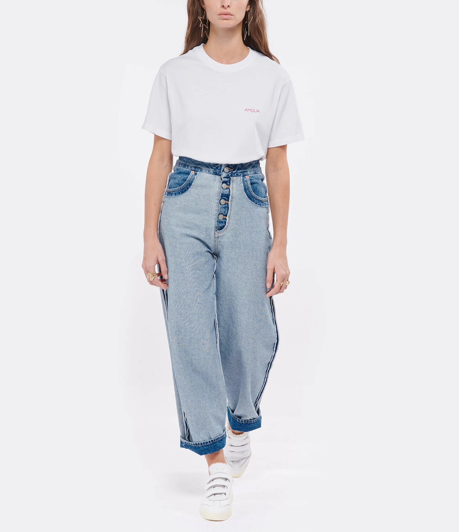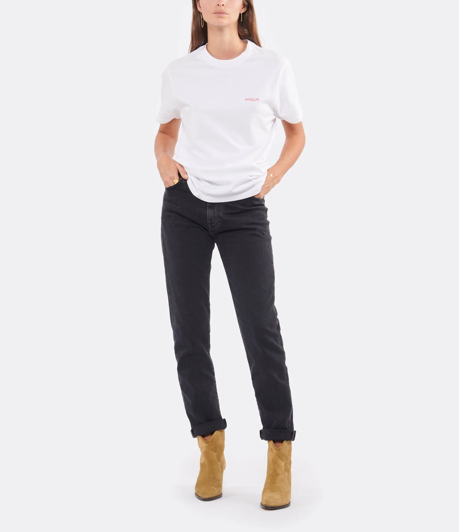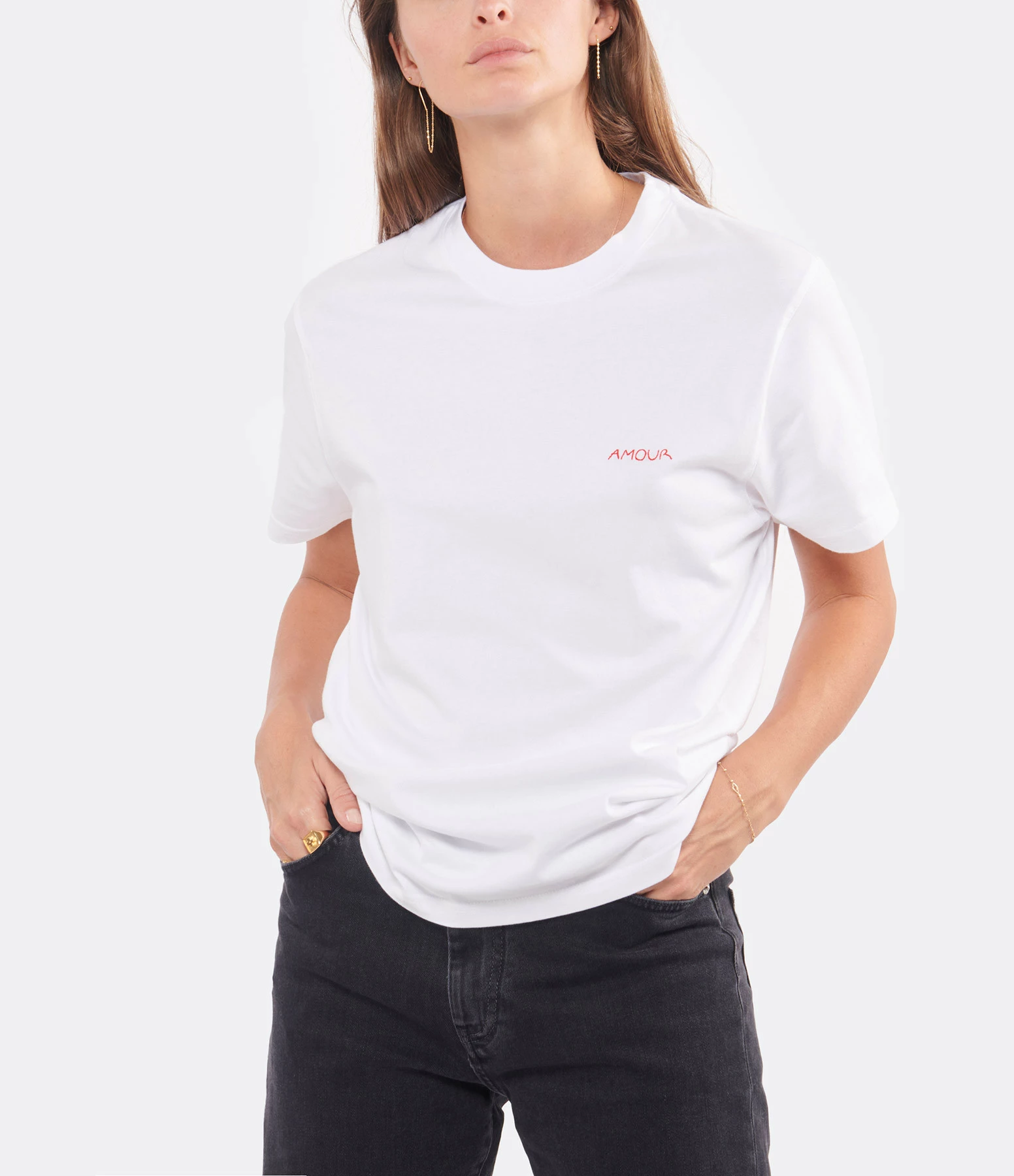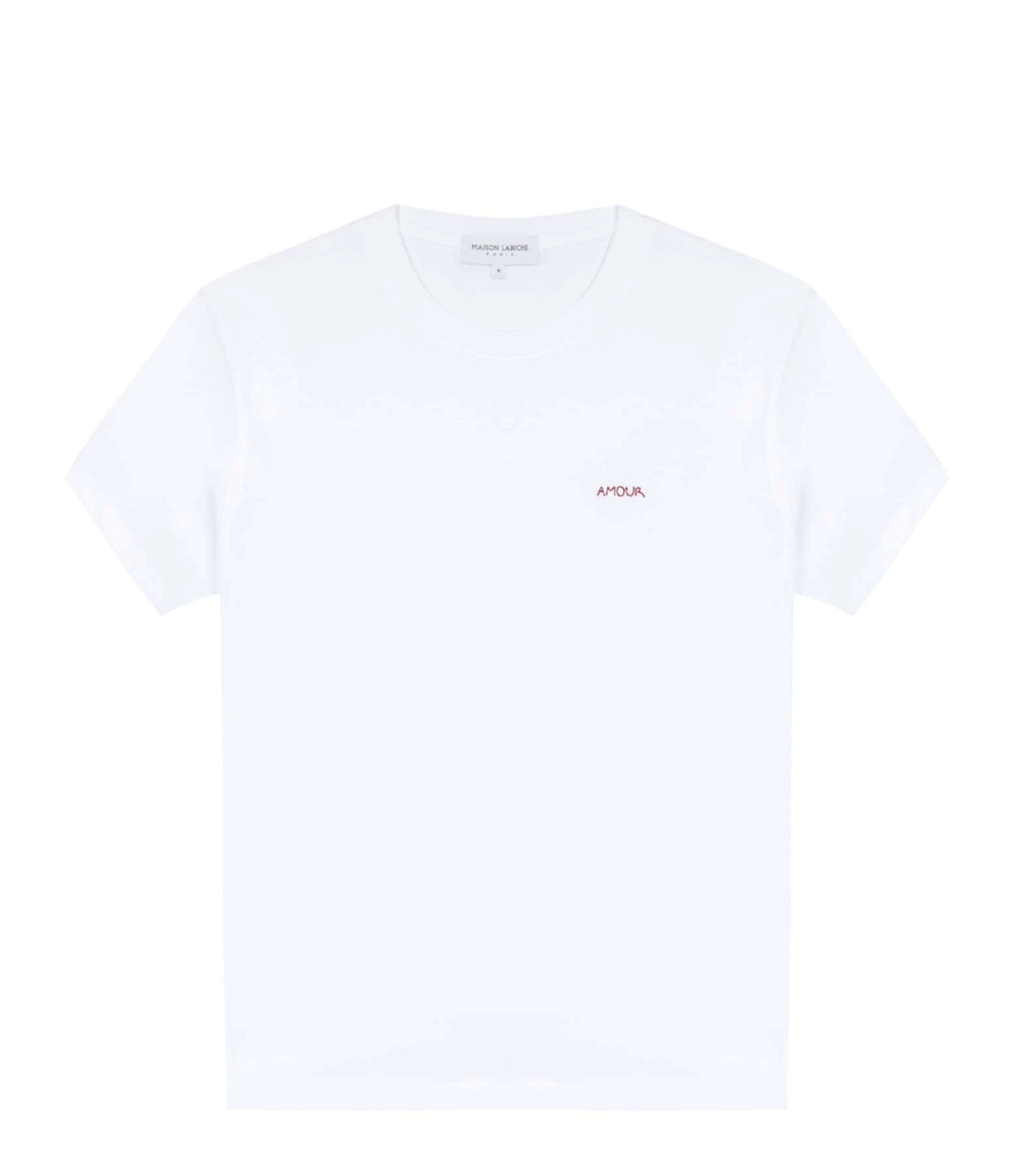 Tee-shirt en coton blanc. Broderie rouge “AMOUR” côté cœur. Col rond. Manches courtes. Coupe droite. Base droite.