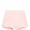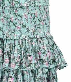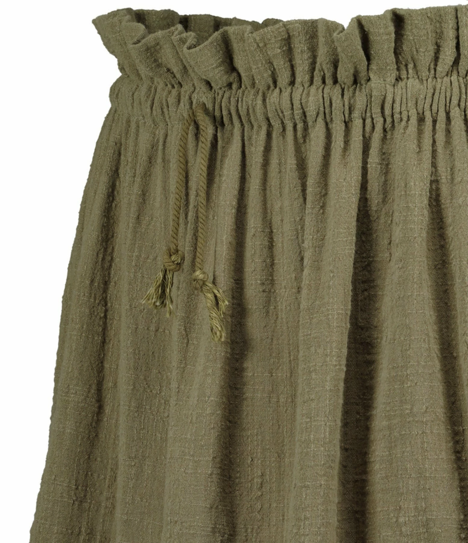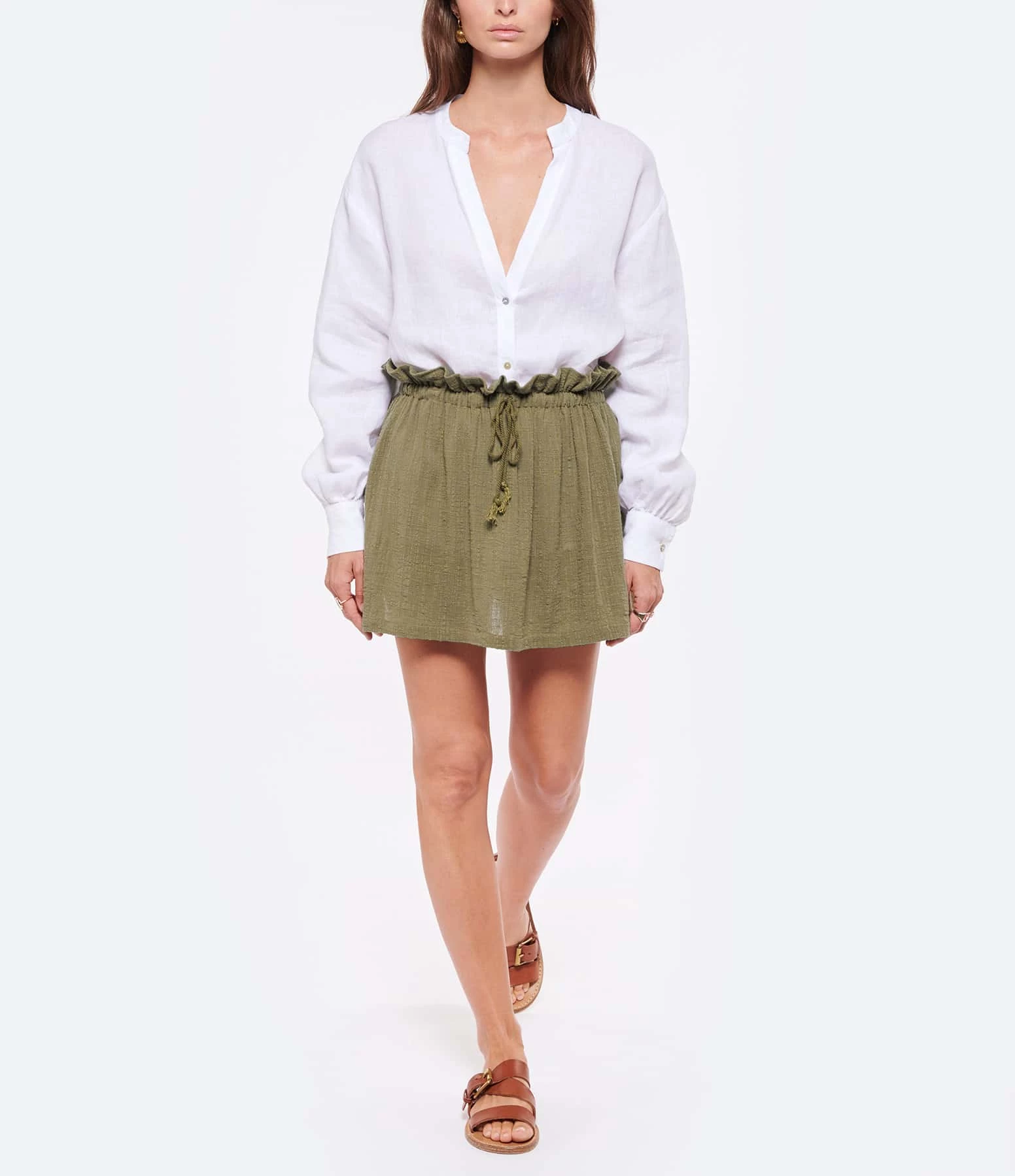 Jupe courte en coton vert kaki. Taille élastiquée avec cordon de serrage. Coupe évasée. Base droite.