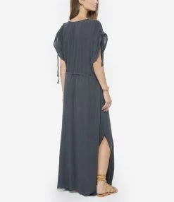 Robe longue en coton bleu. Col en V. Manches courtes tombantes froncées avec lanières d’ajustement tressées. Lien de serrage à nouer à la taille. Coupe droite ample. Base droite avec bords frangés. Fentes latérales. Non doublée.