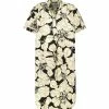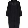 Robe longue en coton bleu. Col en V. Manches courtes tombantes froncées avec lanières d’ajustement tressées. Lien de serrage à nouer à la taille. Coupe droite ample. Base droite avec bords frangés. Fentes latérales. Non doublée.