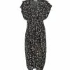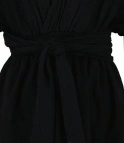 Robe courte en coton noir. Col et dos en V. Manches courtes chauve-souris. Taille haute sous poitrine élastique avec ceinture longue amovible. Non doublé.