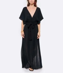 Robe longue en coton noir. Col en V plongeant devant et derrière. Manches courtes. Taille élastiqué. Ceinture amovible à nouer à la taille. Non doublé. Coupe ample. Base droite.