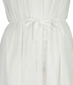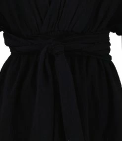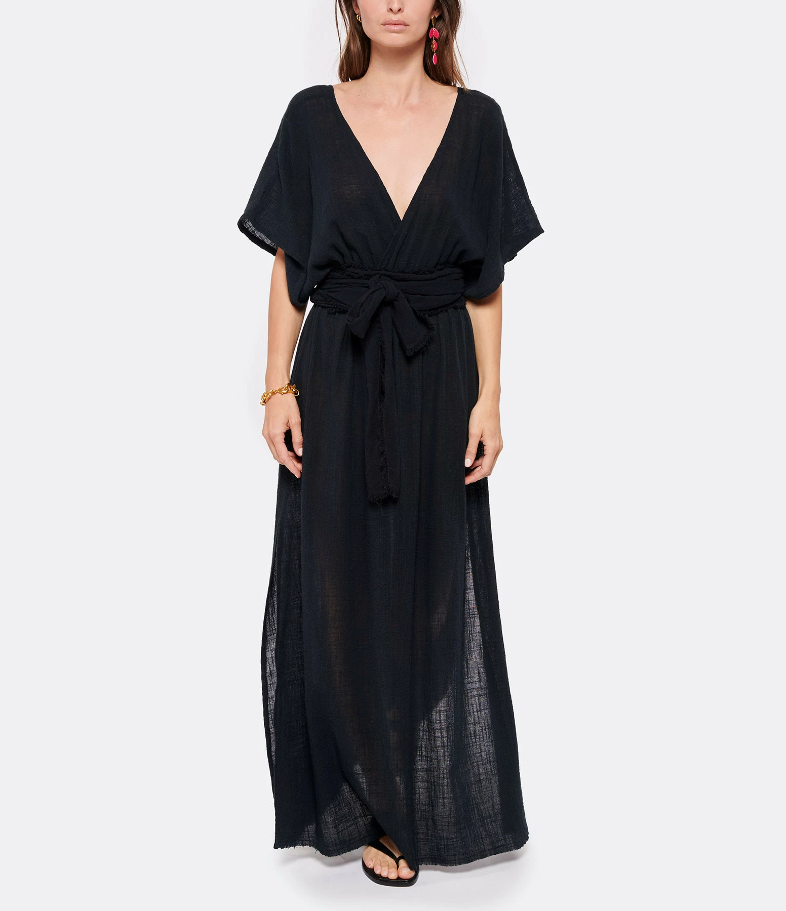 Robe longue en coton noir. Col en V plongeant devant et derrière. Manches courtes. Taille élastiqué. Ceinture amovible à nouer à la taille. Non doublé. Coupe ample. Base droite.