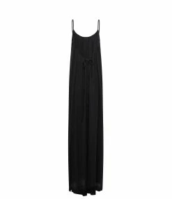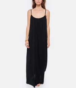 Robe longue dos nu en coton noir. Fines bretelles. Dos nu avec fronces resserré par lien à nouer. Non doublée. Coupe ample. Base droite.