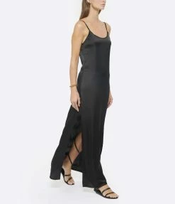 Robe longue dos nu en viscose noire. Fines bretelles réglables. Dos nu en V avec fermeture éclair fine. Fendue sur les côtés au niveau de la cuisse. Non doublé. Coupe ample. Base droite.