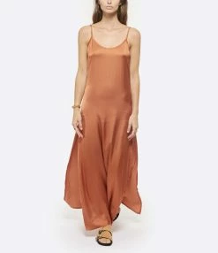 Robe longue dos nu en viscose ocre. Fines bretelles réglables. Dos nu en V avec fermeture éclair fine. Fendue sur les côtés au niveau de la cuisse. Non doublée. Coupe ample. Base droite.
