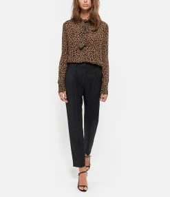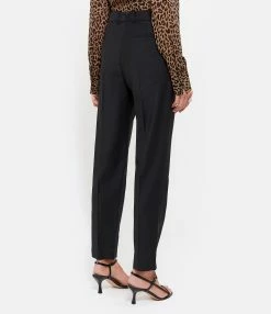Pantalon droit en laine noir pour femme. Coupe classique légèrement loose, finitions discrètes. Pli devant milieu. Deux poches italiennes et deux poches passepoilées à l’arrière. Fermeture par zip.
