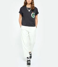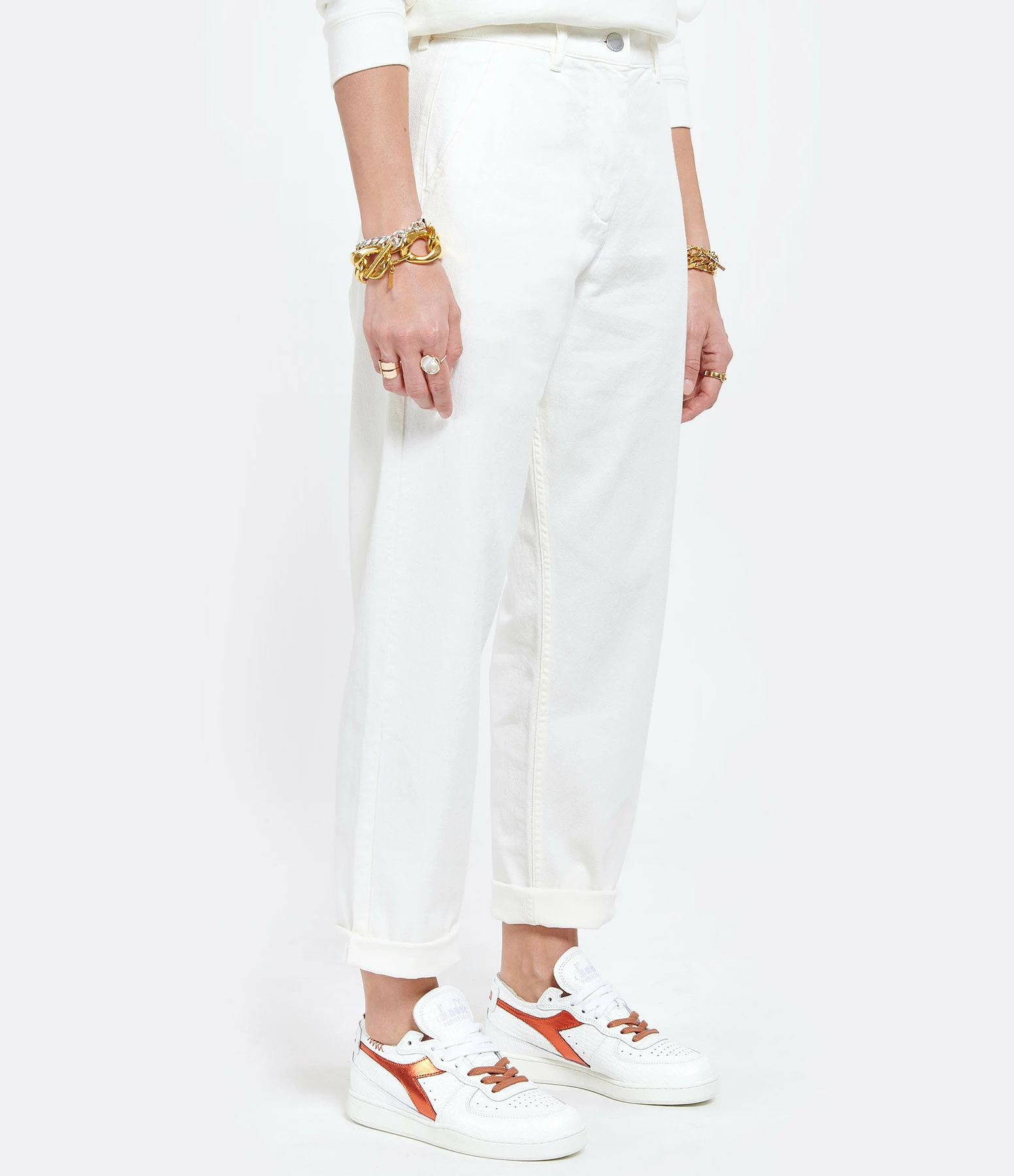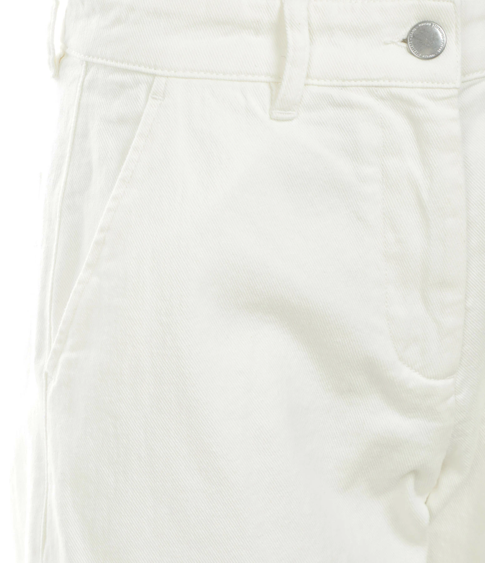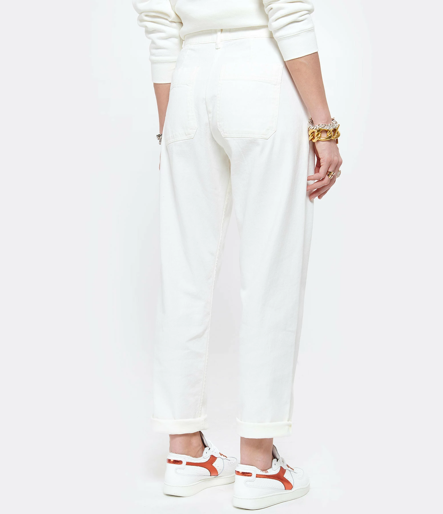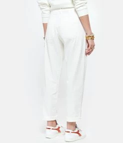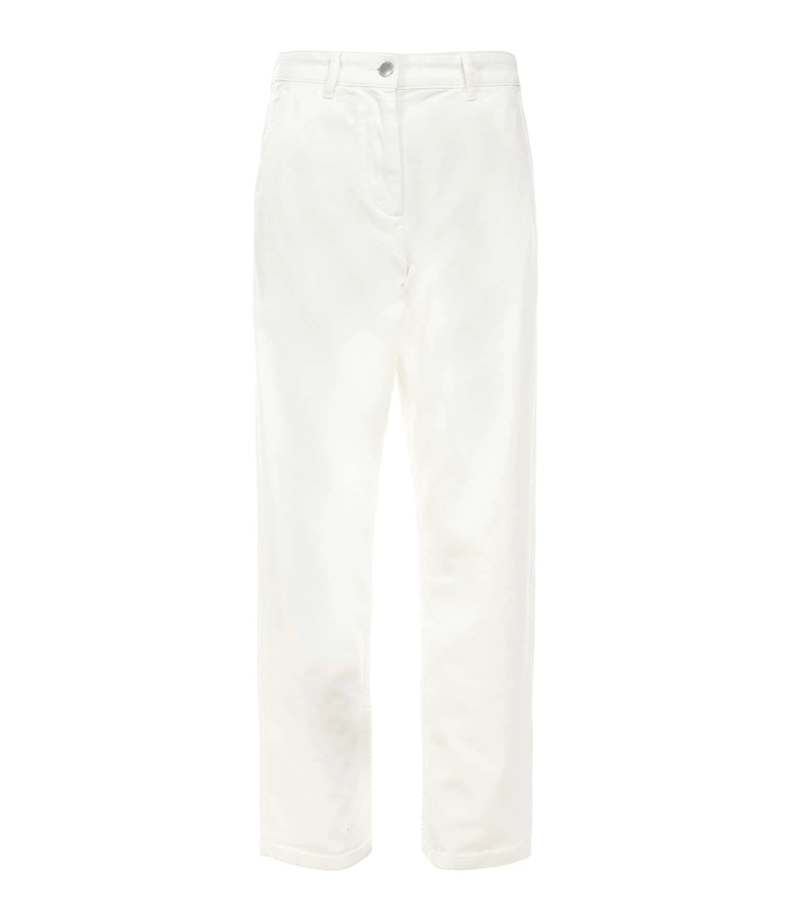 Pantalon en denim écru. Taille haute. Fermeture par bouton et zip. Deux poches italiennes. 2 poches plaquées à l’arrière. Coupe droite. Base droite. Non doublé.