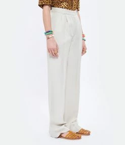 Pantalon à pinces en lin beige. Taille haute. Passants pour ceinture. Deux poches fendues. Une poche passepoilée à l’arrière. Fermeture par zip et agrafes. Coupe large. Base droite. Doublé.