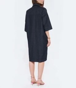 Robe en denim bleu brut. Col chemise. Manches 3/4. Fermeture boutonnée. Deux poches plaquées à rabats boutonnés sur la poitrine et deux poches fendues. Coupe droite. Base droite.