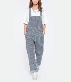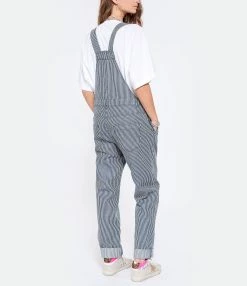 Salopette en denim rayée bleu et blanc. Coupe et fourche larges. Fermeture par bretelles réglables ornées de boucles en métal. Boutons au niveau des hanches. Deux poches à l’italienne sur l’avant et deux poches plaquées à l’arrière. Une grande poche poitrine. Non doublée.