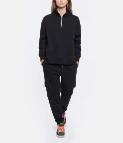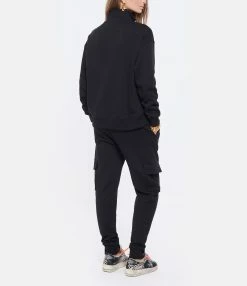 Sweatshirt en coton noir. Col camionneur zippé. Manches longues. Coupe droite. Base droite. Intérieur molletonné.