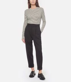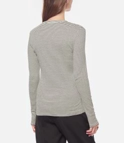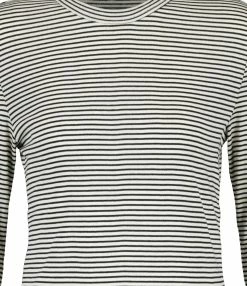 Tee-shirt en coton beige à rayures noires. Manches longues. Col rond. Coupe droite. Base droite.