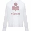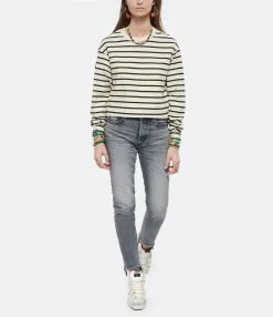 Tee-shirt en coton beige à rayures noires. Manches longues. Col rond côtelé. Coupe droite. Base droite.