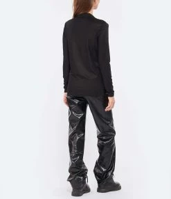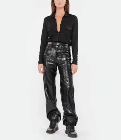 Chemise fluide noire métallisée. Col chemisier. Manches longues. Fermeture par boutons. Deux poches à rabats fermées par boutons au niveau de la poitrine. Coupe droite et base arrondie. Non doublée.