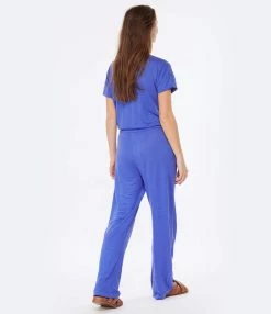 Combinaison longue en lin bleu. Manches courtes. Taille élastiquée. Deux poches latérales sur le devant. Col en V. Fermeture par boutons sur le devant au niveau du buste. Coupe droite. Base droite.