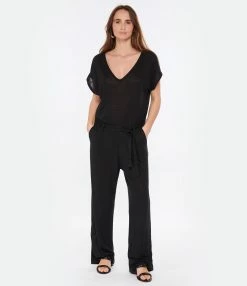 Combinaison longue en lin noir. Décolleté en V. Taille ajustable par cordons à nouer. Coupe évasée. Base droite.