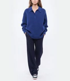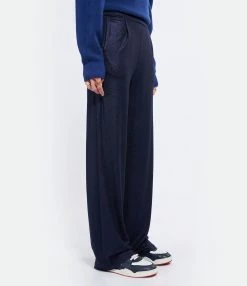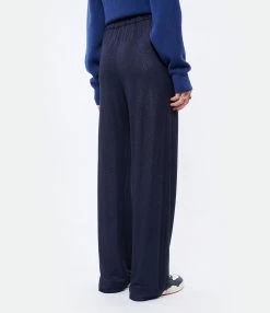 Pantalon droit bleu marine irisé. Taille haute élastiquée. Deux poches fendues. Coupe fluide et droite.