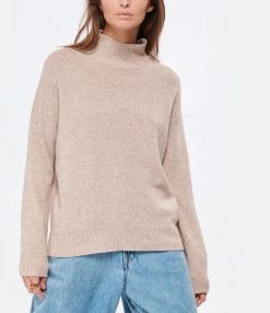 Pull en maille de laine et cachemire mélangés beige rosé. Col montant côtelé. Manches longues avec poignets côtelés. Coupe ample. Base droite côtelée.