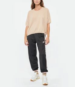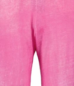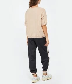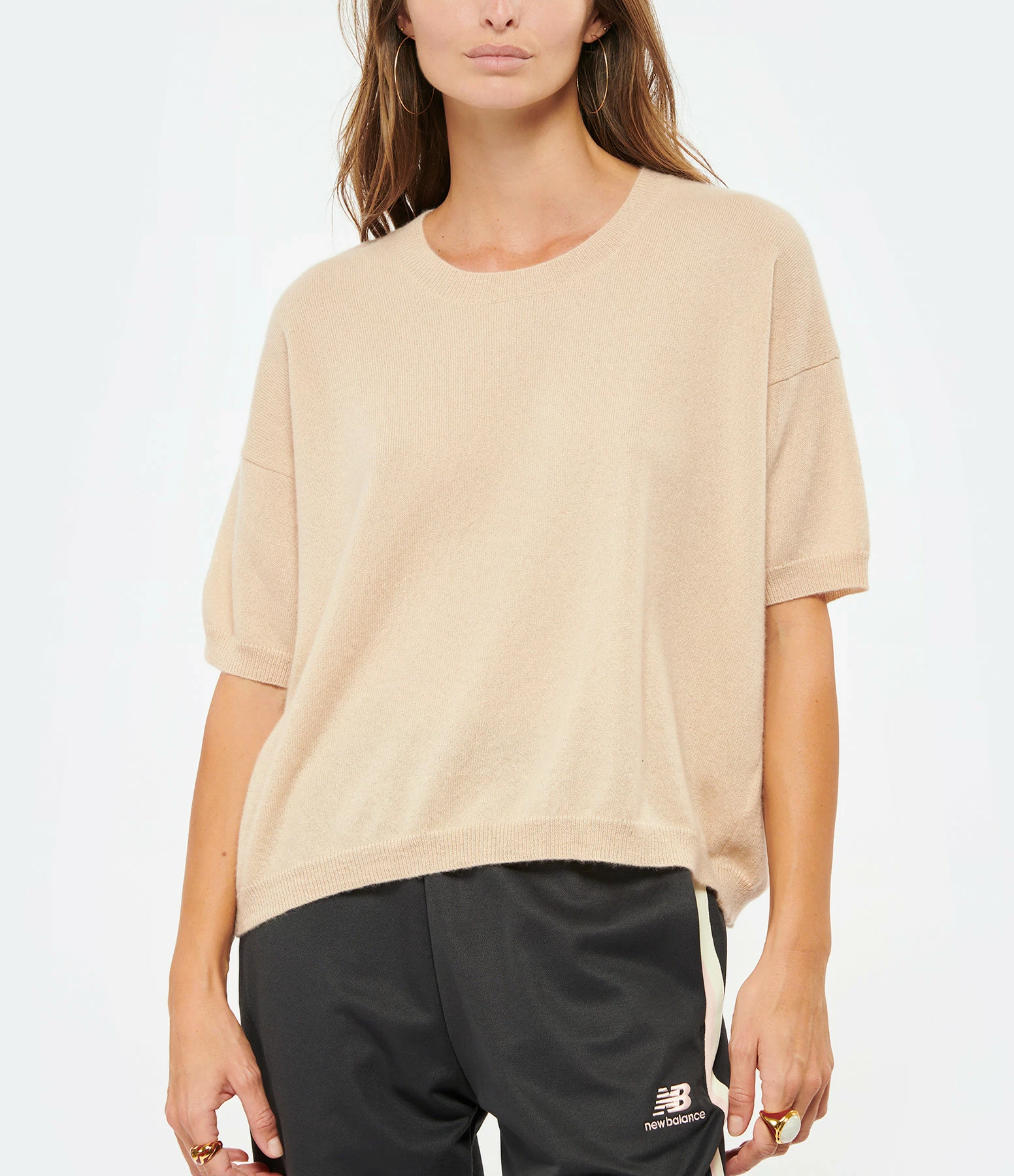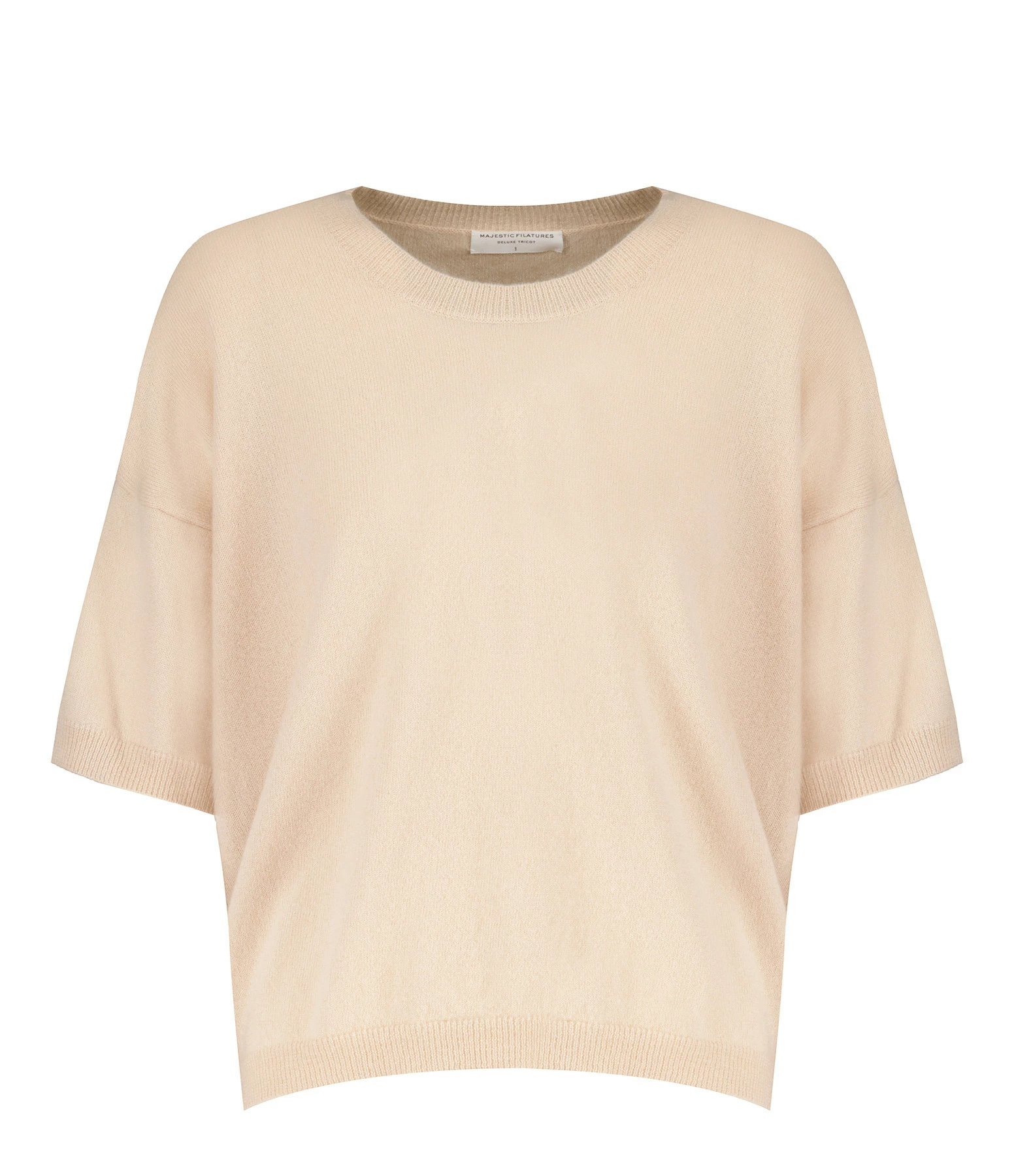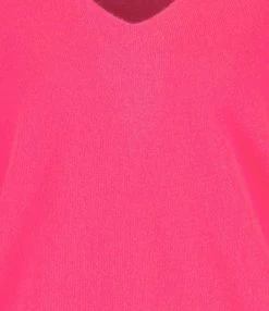 Pull en cachemire rose clair. Col rond. Manches courtes. Finitions par bord côtes au niveau du col, des poignets et du bas de la robe. Coupe droite. Base droite.